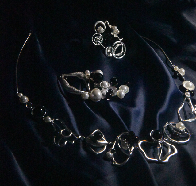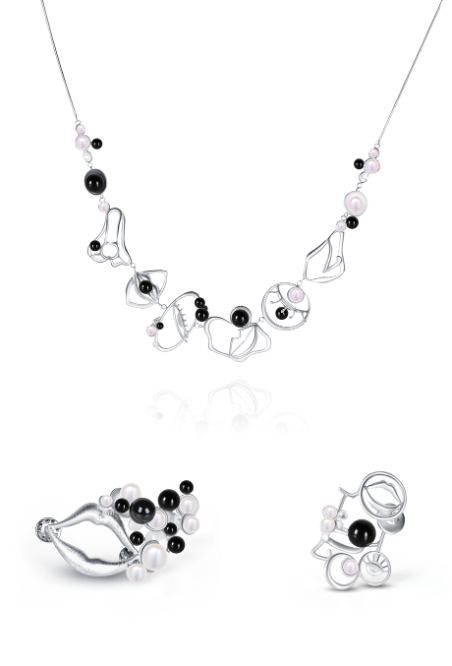 本套設計來源于“掙脫思想的捆綁”,將“掙脫捆綁”這一想法通過具象的事物——五官予以表現。設計上以五官的單獨拆分、解構、重組,錯位排列來代表思維的開拓,材料上選擇銀和黑、白珍珠以形成視覺上的強烈對比,來表達對思想捆綁的排斥與抗拒。