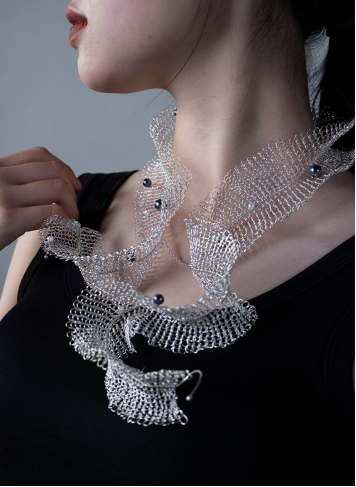 材料上選擇銀和黑、白珍珠以形成視覺上的強烈對比,來表達對思想捆綁的排斥與抗拒。