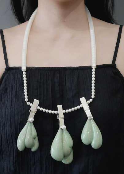以夾子作為焦慮壓力的符號,通過佩戴者夾放的過程來隱喻抒發焦慮,在夾的壓力下下墜的曲線形態和可以滑動的珍珠項鏈增加趣味性的同時也詮釋出壓抑與釋放的平衡。