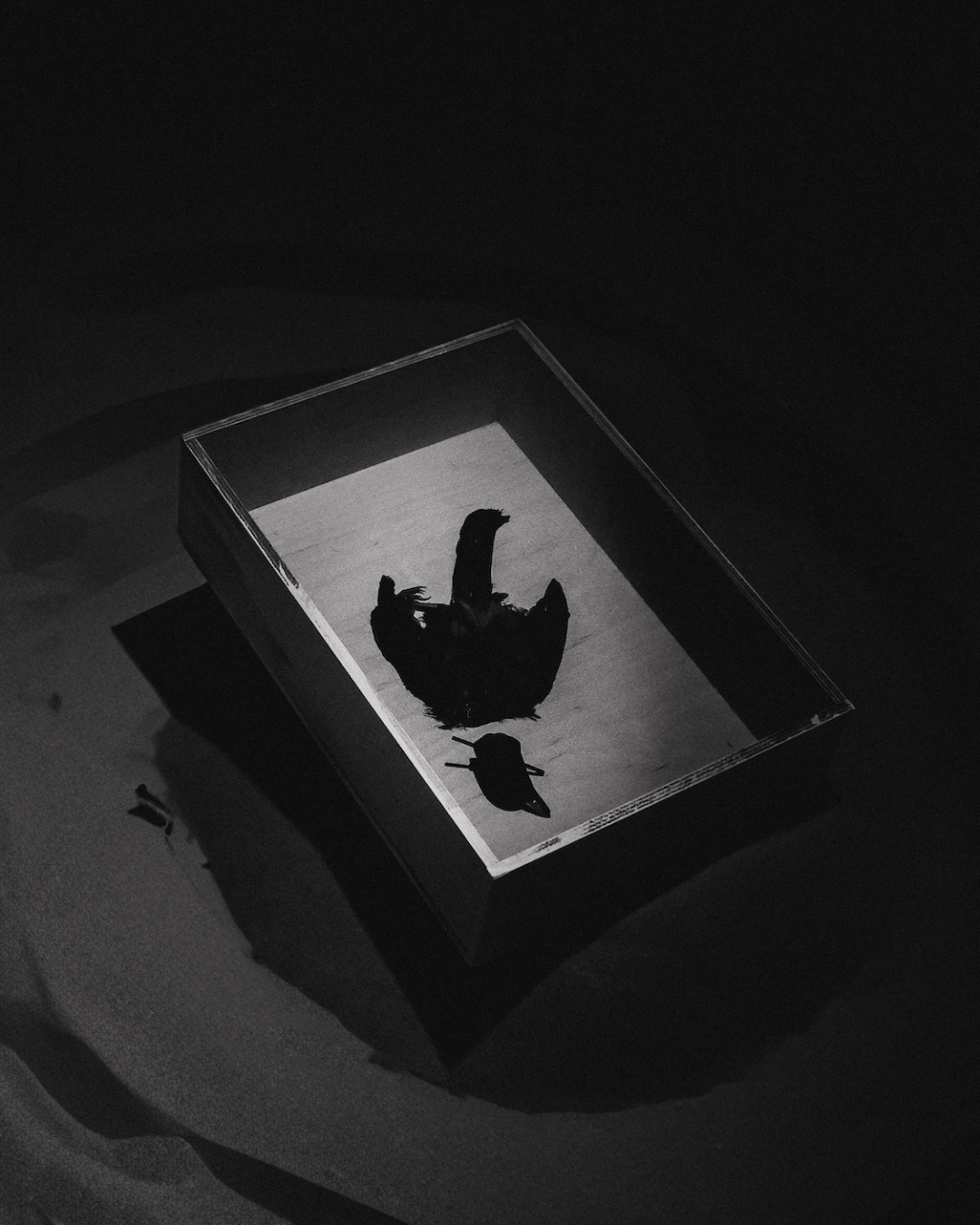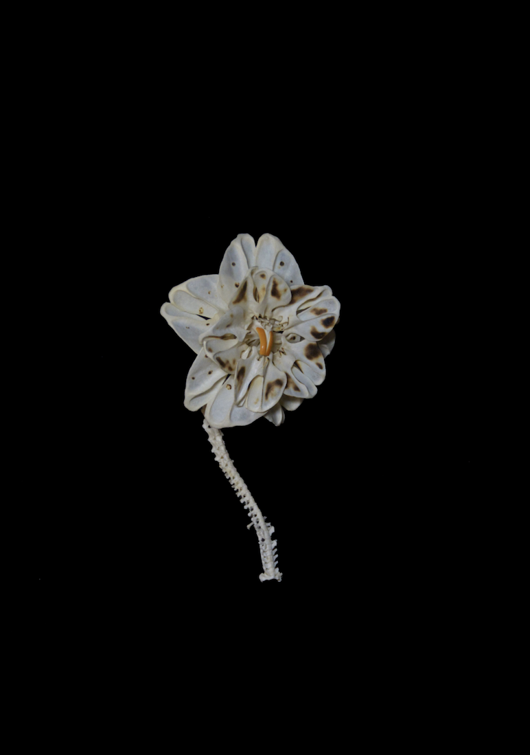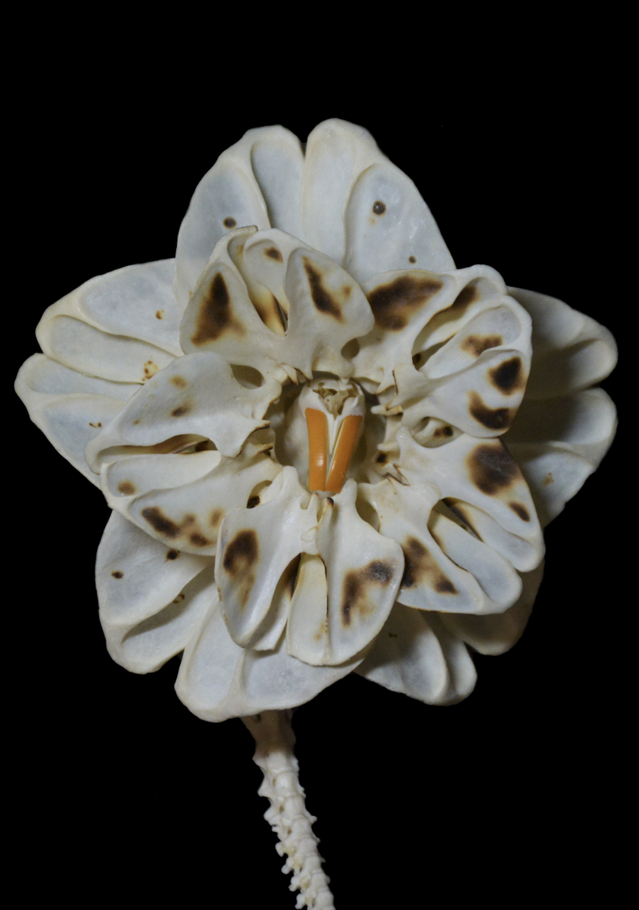對于這種現象,我感到悲哀和無力。因此,我收集了許多動物的殘骸來形成一種視覺對比。我將這些人們認為無用或反感的部分轉化為一種珍貴和悲傷的感覺,以表達我對動物的哀悼和敬意。我想通過這種方式讓人們重新思考對生命價值的定義。