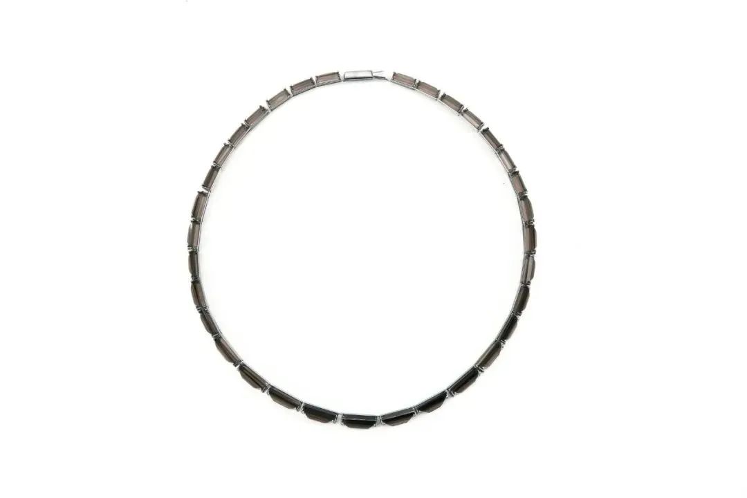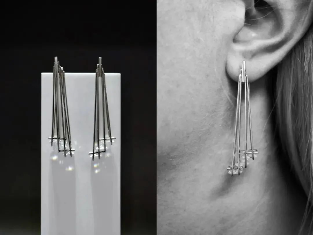 在她的作品集中,洛伊絲融入了類似腳手架、梁和工業(yè)結(jié)構(gòu)的元素,以不同的角度鑲嵌石頭。通過利用煙熏石的獨特特性,她實現(xiàn)了類似黎明的漸變效果。長方形石頭的幾何切割增強了它們的光澤,而不銹鋼結(jié)構(gòu)則為佩戴者提供支撐。