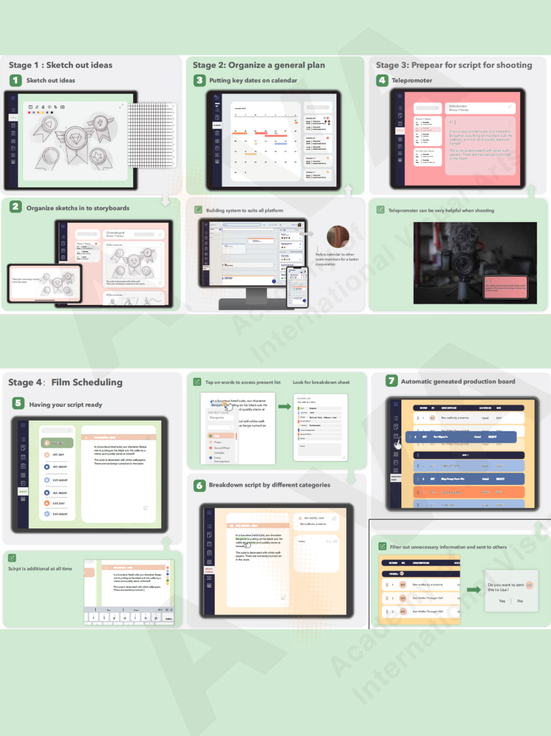 作品《Film Scheduling Application》 是一個主要服務(wù)于電影時間表的應(yīng)用程序。作者將一部電影的制作拆解成不同的小板塊,并借助APP使得普通人也能簡單上手,將一些小的靈感迅速轉(zhuǎn)化成完整的流程。