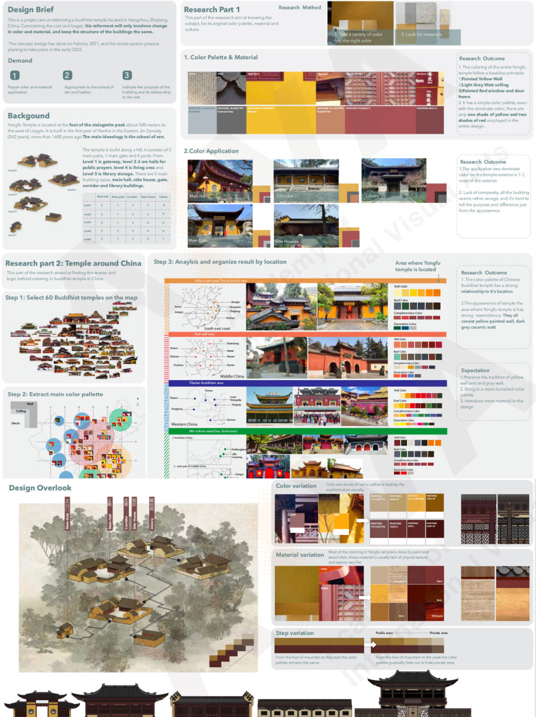 《永福寺色彩改革》是一個旨在改造位于中國浙江杭州的佛教寺廟的項目。考慮到成本和預(yù)算,這次改造將只涉及顏色和材料的變化,并保持建筑物的結(jié)構(gòu)不變。概念設(shè)計已于2021年2月完成,施工過程計劃于2022年初進行。