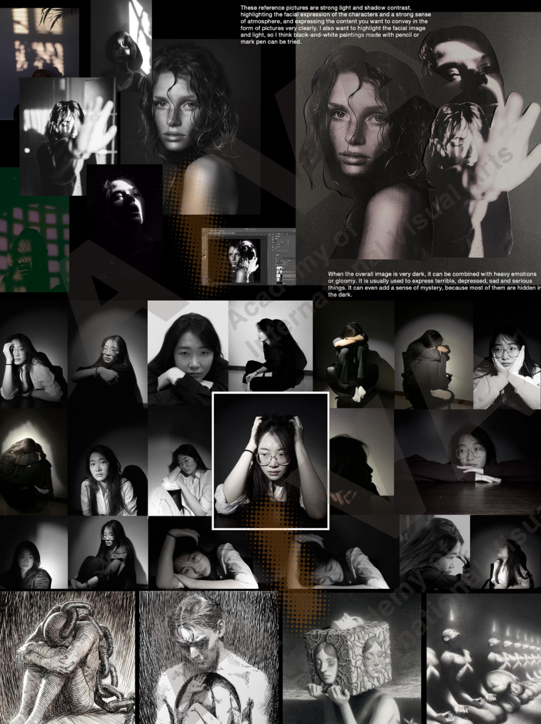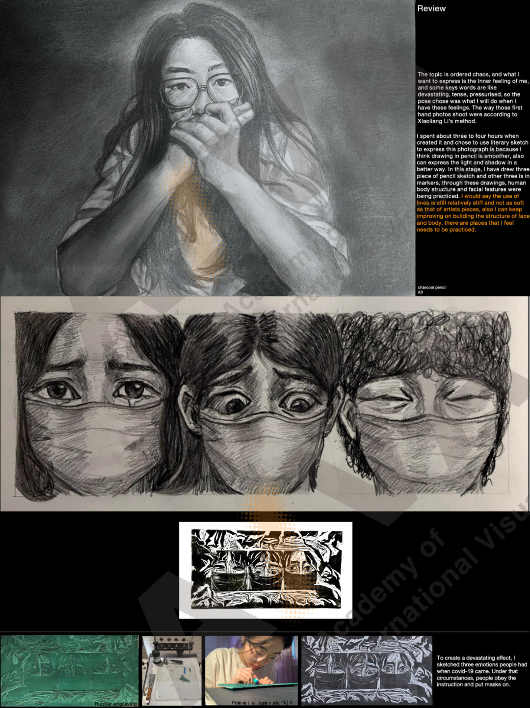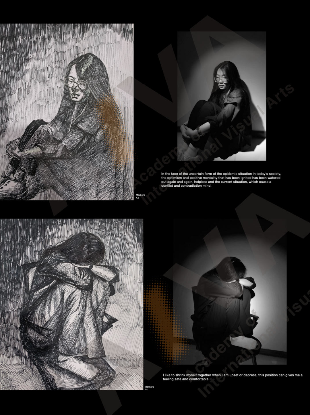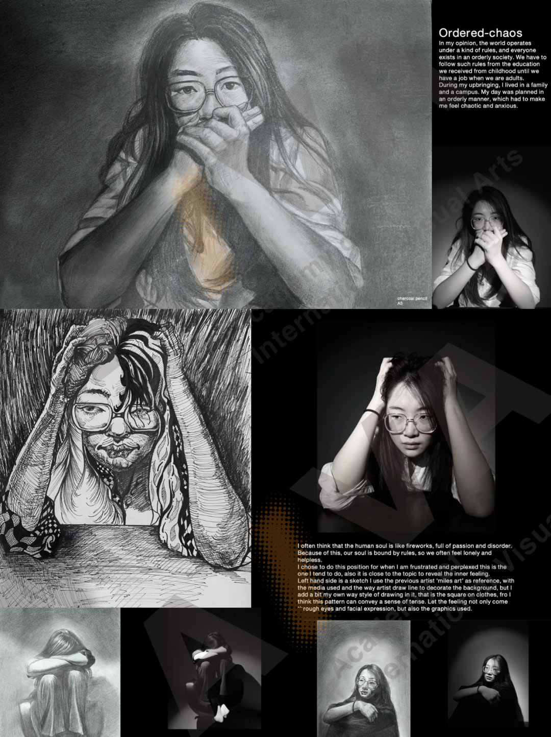 在 "有序的混亂"這個主題下,我想表達(dá)我內(nèi)心真實(shí)的感受,而一些關(guān)鍵詞是 "毀滅性"、"緊張"、"壓力",所以我選擇的姿勢都是我有這些感受時(shí)會做的。第一手參考照片的拍攝方法我采用了李曉亮的方法,突出了光影的明暗對比。在繪畫創(chuàng)作階段,我在創(chuàng)作時(shí)花了大約三四個小時(shí),選擇用純素描來表現(xiàn)這張照片,是因?yàn)槲矣X得用鉛筆畫更流暢,也能更好地表現(xiàn)光影。