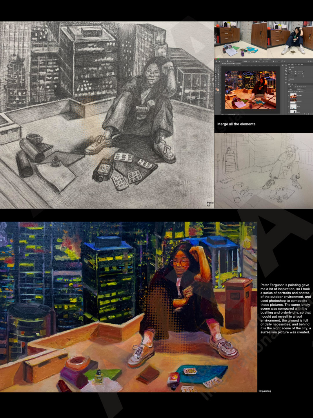 彼得·弗格森的畫給了我很多靈感,因此我拍攝了一系列肖像畫和戶外環(huán)境照片,并用 photoshop 合成了這些圖片。同樣的孤獨場景與繁華有序的城市進行對比,讓我置身于屋頂?shù)沫h(huán)境中,地面上擺滿了生活用品,背后是城市的夜景,一幅超現(xiàn)實主義的畫面就這樣產生了。