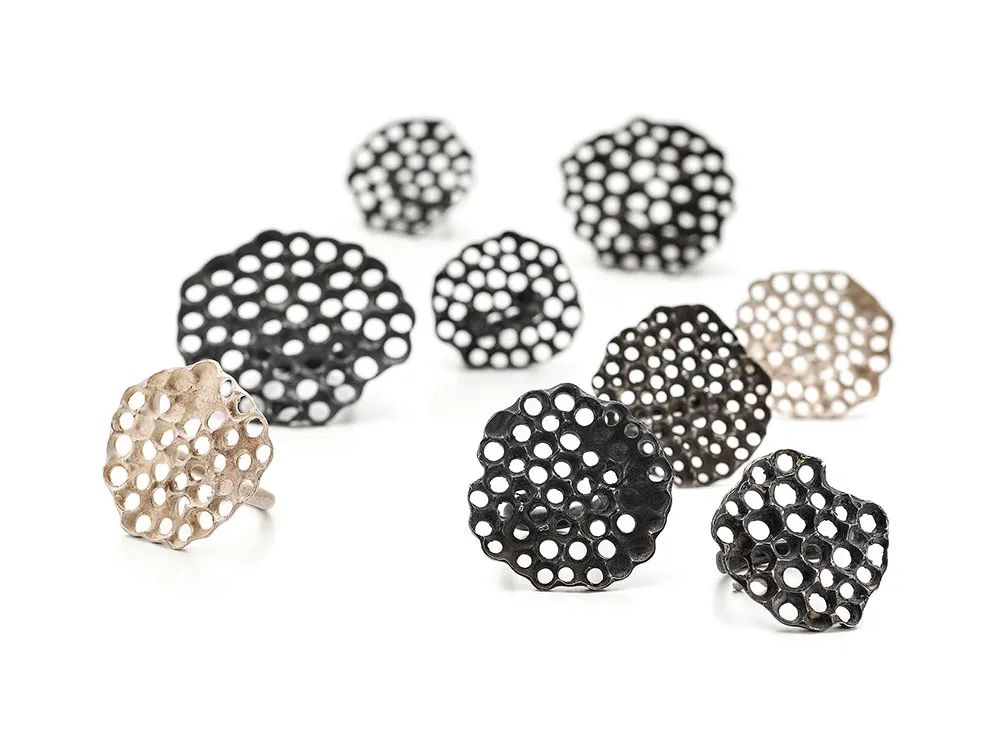 對于Hee-ang來說,蘑菇絕不僅僅是餐桌上的食物。在一次散步中,她偶然發現一株野生蘑菇,被它獨有的美所觸動,這使她有機會去深入研究這一特別的生物。最初,她嘗試用作品去還原一株完整蘑菇的構造,以展示其本身的復雜細節。然而隨著時間的推移,她發現從蘑菇的萌芽到腐爛的整個生長過程,都給她帶來了極大的啟發。Cluster系列以蘑菇“鰓”為主要設計元素,想象了蘑菇群是由廣泛分布的地下菌絲體形成的。另一方面,Inside Out系列設想將蘑菇帽翻過來,露出“鰓”,在內部和外部紋理之間形成節奏對比。Bloom and Wither捕捉了蘑菇生命周期的各個階段,而Slowly則描繪了蘑菇逐漸展開的過程。