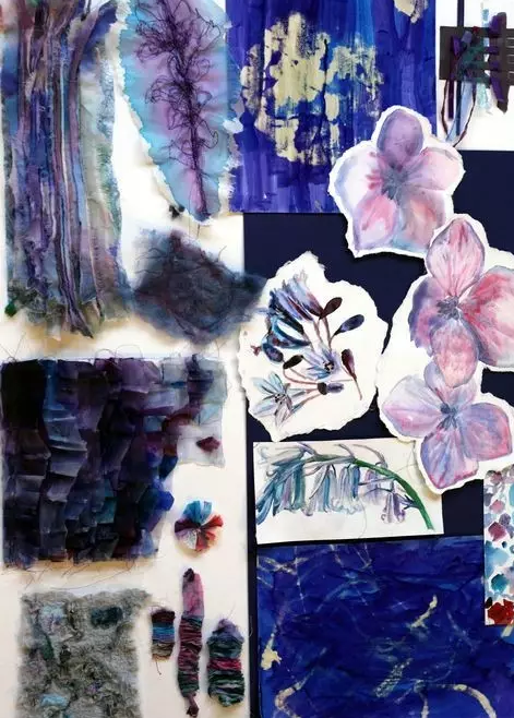 正式展示項(xiàng)目是從research 開始,包含所有靈感,keywords,利用圖片進(jìn)行展現(xiàn),是設(shè)計(jì)過程的第一步。大家可以看到下面這個(gè)案例,以花為主靈感源,進(jìn)行observation drawing,提取花的色彩、元素,結(jié)合所需要的面料,進(jìn)行一些面料改造,作為Research的第一步。