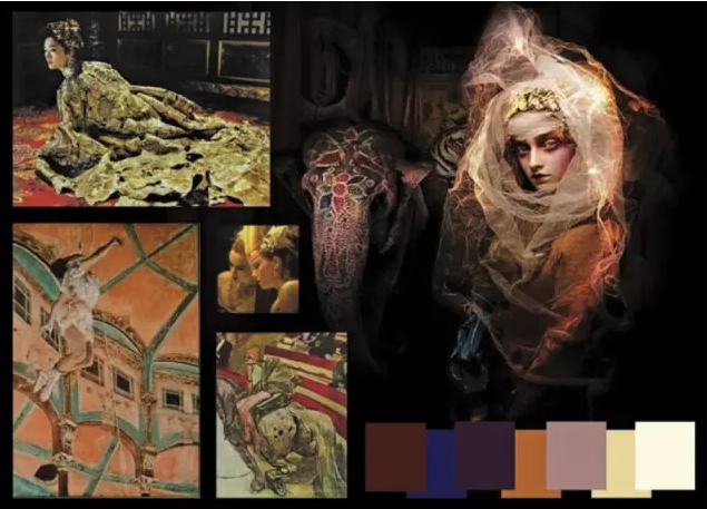 接下來就是設(shè)計(jì)作品集中不可缺少的moodboard(情緒板),情緒板是在工業(yè)產(chǎn)品設(shè)計(jì)中也經(jīng)常需要用到的,但是在每個(gè)專業(yè)中情緒板的作用和包括的內(nèi)容是截然不同的,在服裝設(shè)計(jì)中,情緒板可以由inspiration board、color board、material board、detail board等組成。給大家舉的例子就是material board和color board,當(dāng)然moodboard也可以用一張圖來表現(xiàn)。