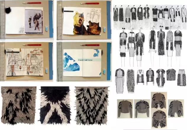 第三,設(shè)計(jì)的衍生發(fā)展過程是最重要的,因?yàn)榭梢苑磻?yīng)作品創(chuàng)作的流程,你的成衣是經(jīng)過一系列嘗試實(shí)驗(yàn)得來的,而不是憑空而來的。
