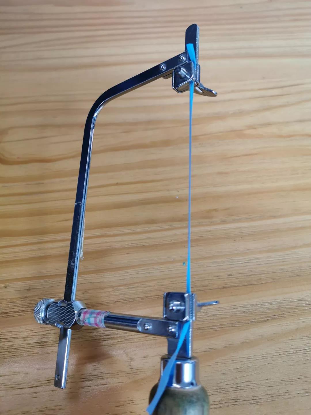 選擇一根拋光帶,與裝鋸條(不會裝鋸條的同學抓緊復習)的方法一樣,將其裝到鋸弓上面,繃緊。拋光帶是有正反面的,可以將它縱向對折,帶目數的面朝外,也可以直接側過來拉平安裝。