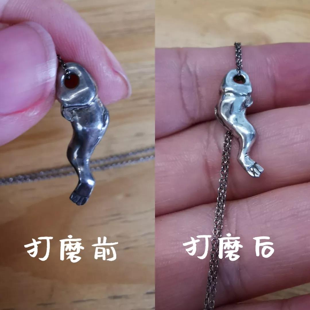 下面以曉辰老師的小魚干吊墜為例進行效果演示,因為長時間放置加上上海的強大濕力,小魚干吊墜表面已經氧化暗淡了,拋光帶可以貼合小魚干表面的角度進行打磨,如果拋光物件有孔洞造型,也可以像做鏤空切割時一樣將拋光帶穿過空洞進行拋光。