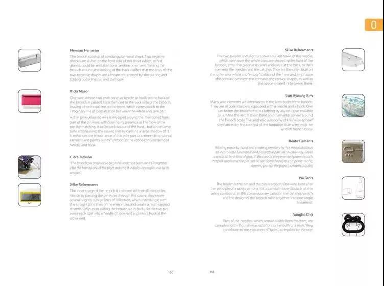 X:《To The Point》是一本專門講解藝術首飾中胸針背針的各種存在形式的書。在AIVA的金工課程中,我們會統一教學最基本、最常用的單針和雙針的背針形式,而在實際的創作中,通常需要作者在滿足這些基本結構要求的情況下根據自己的胸針特性去設計自己背針。這本書收集了大量藝術家的胸針作品作為實例,詳細的為我們歸納、羅列出了背針的各種可能性。