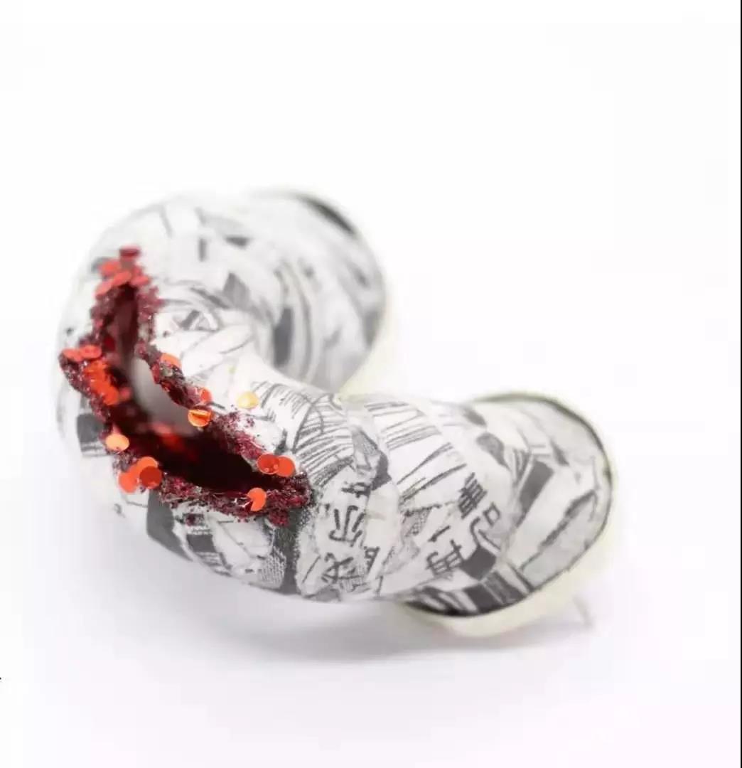 Xiaochen 把兒時翻閱的漫畫書紙張作為創作的材料來塑造作品的主體外型,它以首飾的形式附庸于身體之上,成為連接人體的一個部分。Xiaochen把它看作是自己內心世界的一種外露,這不僅需要時間,還需要勇氣。