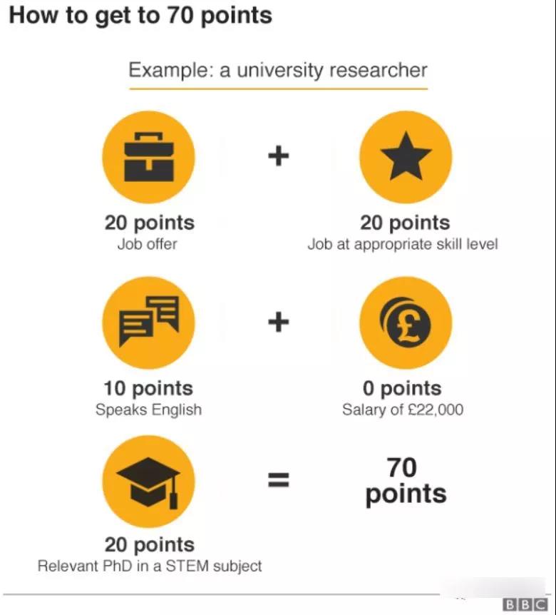 簡單來說,如果一位移民者能說英語,并獲得一份有“政府認(rèn)可的擔(dān)保單位”提供的技術(shù)工作,并且有專業(yè)技能,他們將獲得50分。此外,具備博士學(xué)位學(xué)歷STEM獲得20分,一共獲得70分,達(dá)到工簽標(biāo)準(zhǔn)。