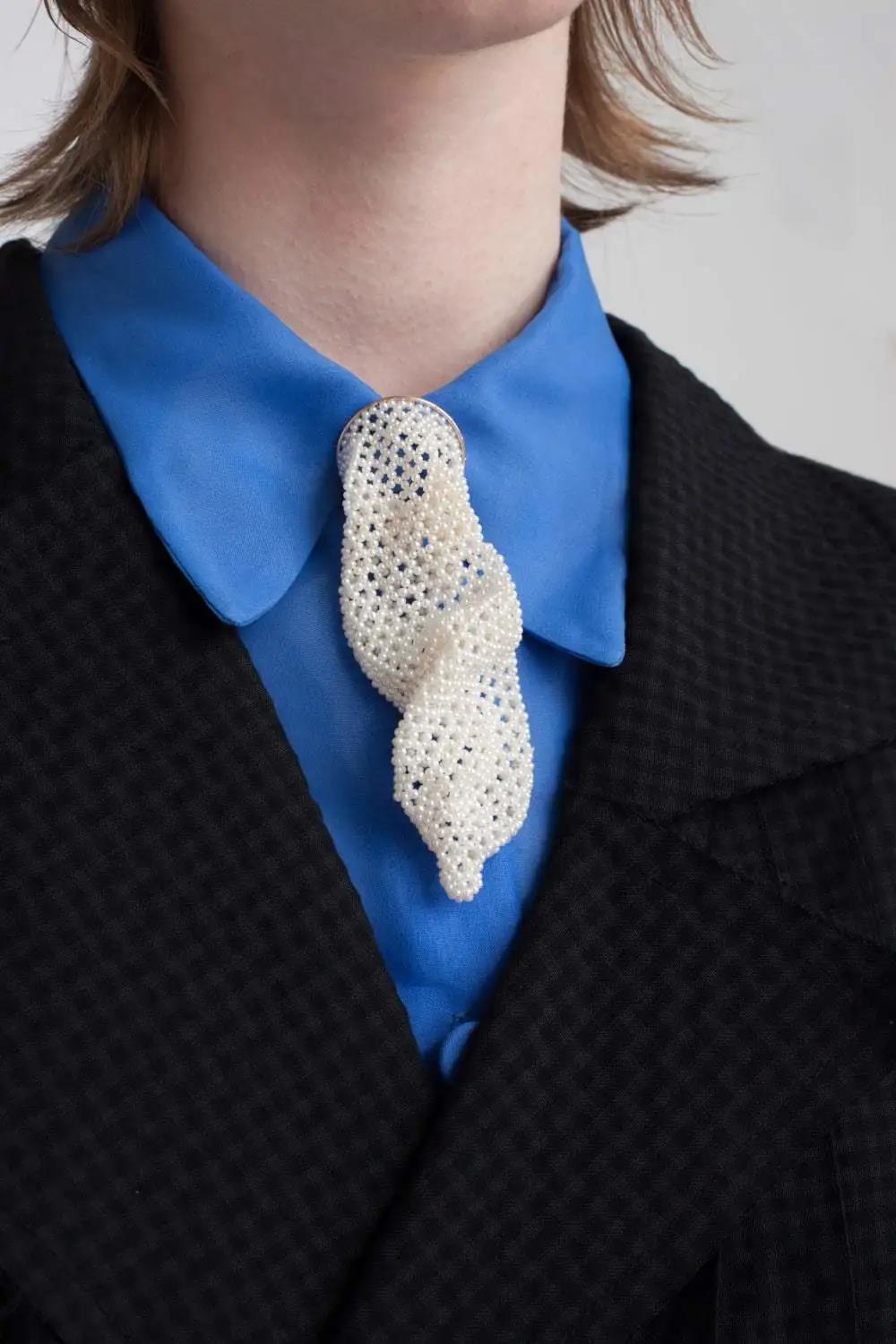 其中一件胸針 "Gender: In a man’s world" 的靈感來自于 Wen-Ju 文化背景中根深蒂固的性別偏好。為什么出生時的性別決定了一個人的價值?Wen-Ju試圖通過使用珍珠這種通常與女性氣質相關的材料來創造一種男性的形態和象征,呼吁性別平等。她用珍貴的材料精心制作每一件首飾來提升物品的地位,在自由的個體與支配我們的官僚身份之間制造出了一種張力。