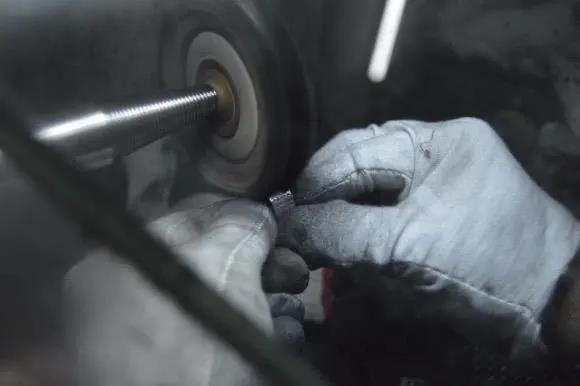拋光操作者的拋光手法也將影響拋光質(zhì)量,拋光操作手法不正確就不可能拋好首飾。一般來講,拋光時盡量使首飾與拋光布輪平行、雙手握緊首飾并從上而下順著布輪移動方向。拋光務(wù)必一次均勻地將首飾全部分過完,每個部位都要拋到位。