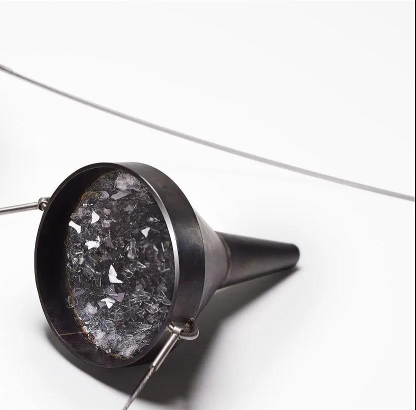 在她的作品中,我們可以看到脆弱的世界經(jīng)過了修繕;看到破損、骨折;人類被共同的危險聚集在一起:這是一種美麗的破碎。作品外部結構采用實驗室工具一般嚴謹?shù)慕Y構,內(nèi)部則揭示了折射玻璃碎片微妙與秘密的世界。光線輻射效果取決于每個碎片的方向,這使得光線變得忽明忽暗。