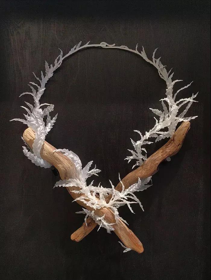 芬蘭設計師Wiebke Pandikow用回收塑料袋和木頭做了這件作品。 她開發了只用熨斗和金屬焊接制作首飾的技術。她將常被視為的廢舊材料制作成首飾,希望以此提醒人們意識到這種材料的消極和積極雙重影響。