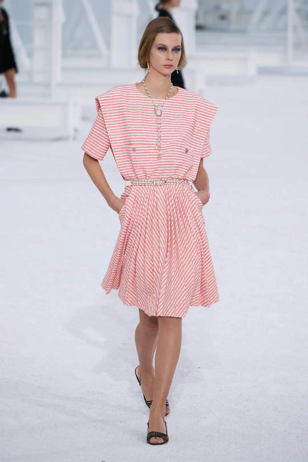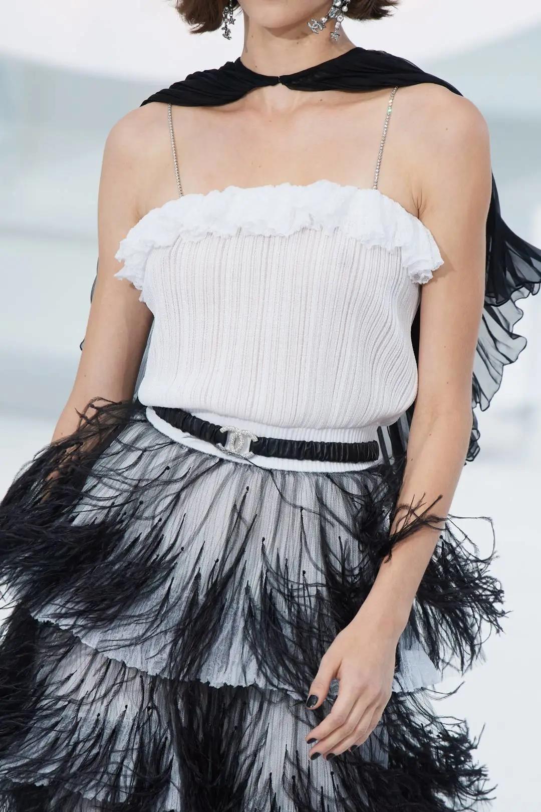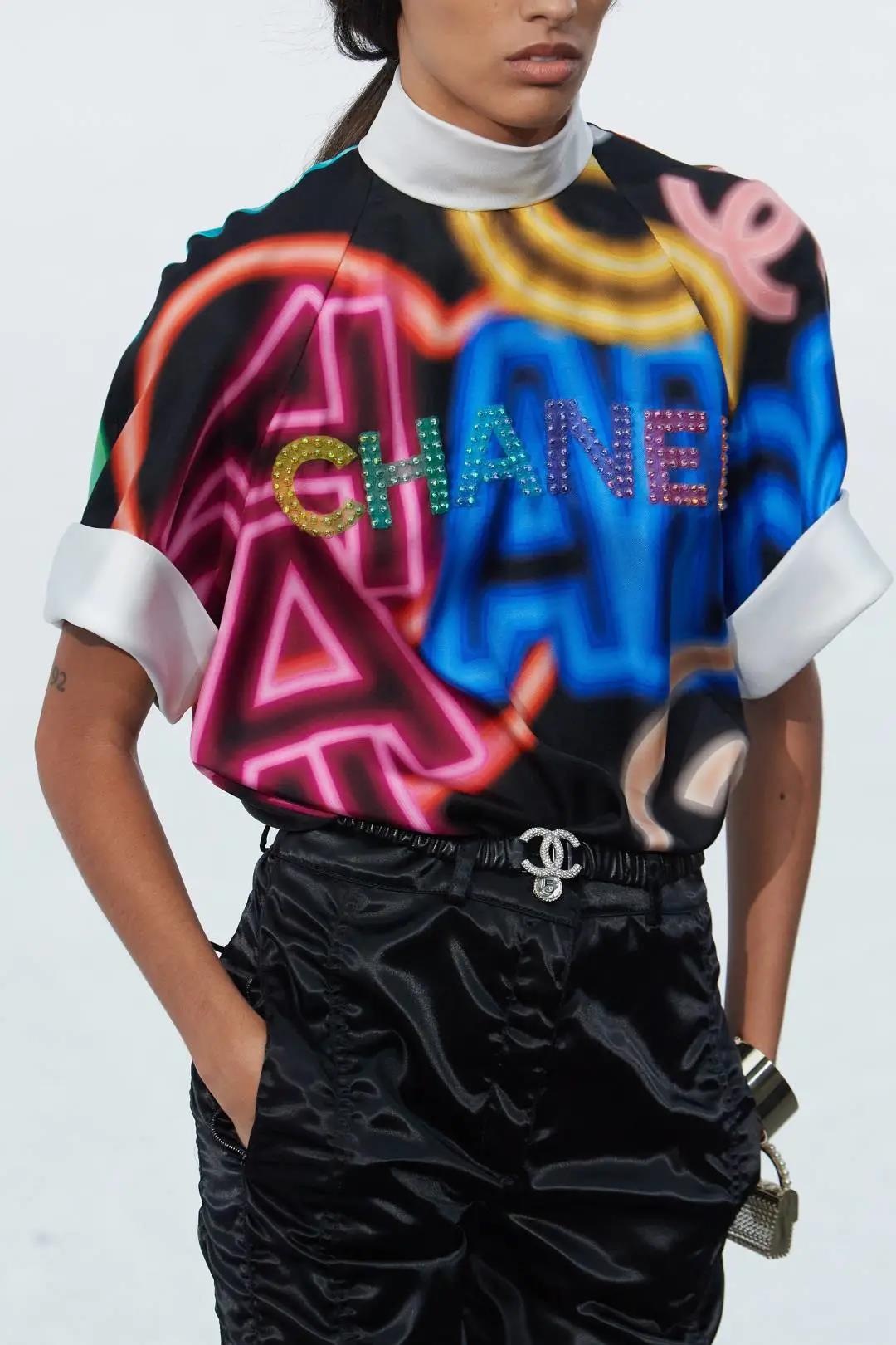 本季Virginie Viard以Chanel女士的靈感繆斯為靈感,致敬電影藝術。黑與白作為主要的基調貫穿整季,再現了復古黑白電影中經典的Chanel乳白與黑色斜紋軟呢套裝。在延續致敬經典的同時,該季度也更加注重實用性和年輕化。霓虹Chanel字母的圖案面料,明亮的春季配色為新一季的春夏注入活力。