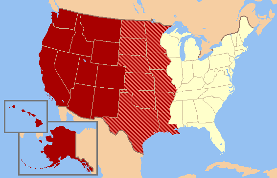 包括加州CA,華盛頓州WA,猶他州UT,科羅拉多州CO,阿拉斯加州AK,愛達荷州ID,蒙大拿州MT,俄勒岡州OR,懷俄明州WY,亞利桑那州AZ,夏威夷州HI,內(nèi)華達州NV、新墨西哥州NM