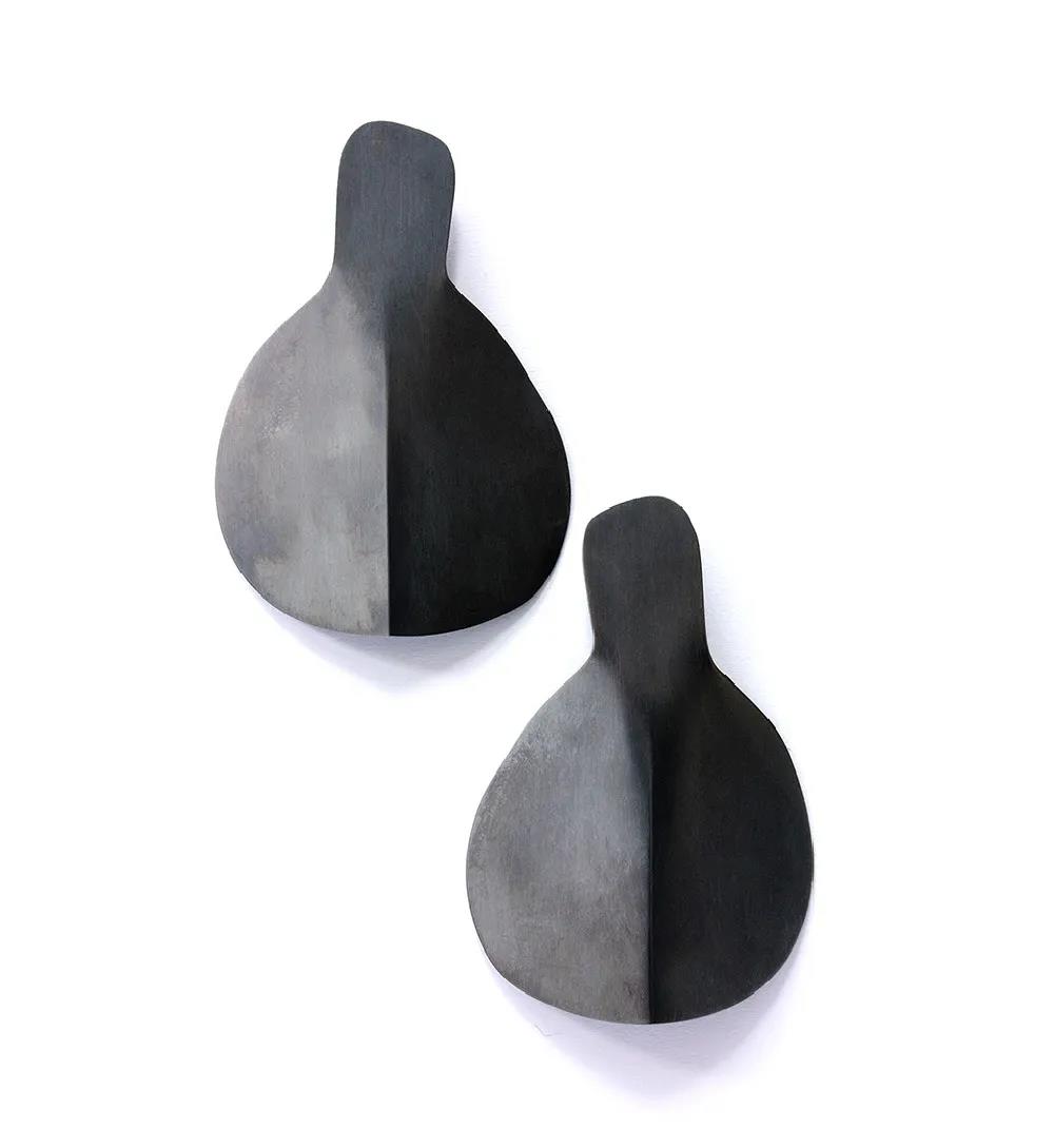 兩件胸針彼此對比:一樣的形態,一樣的大小,一樣的材質和一樣的概念。唯一不同的是色彩。