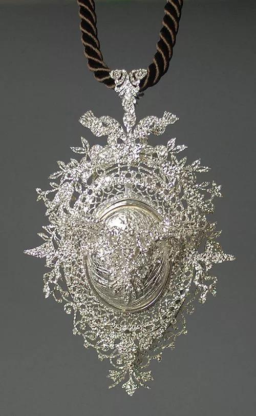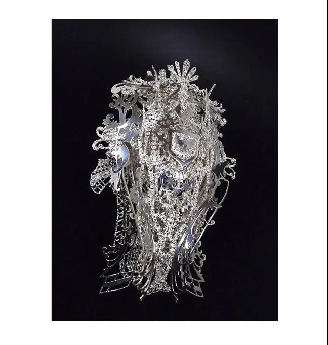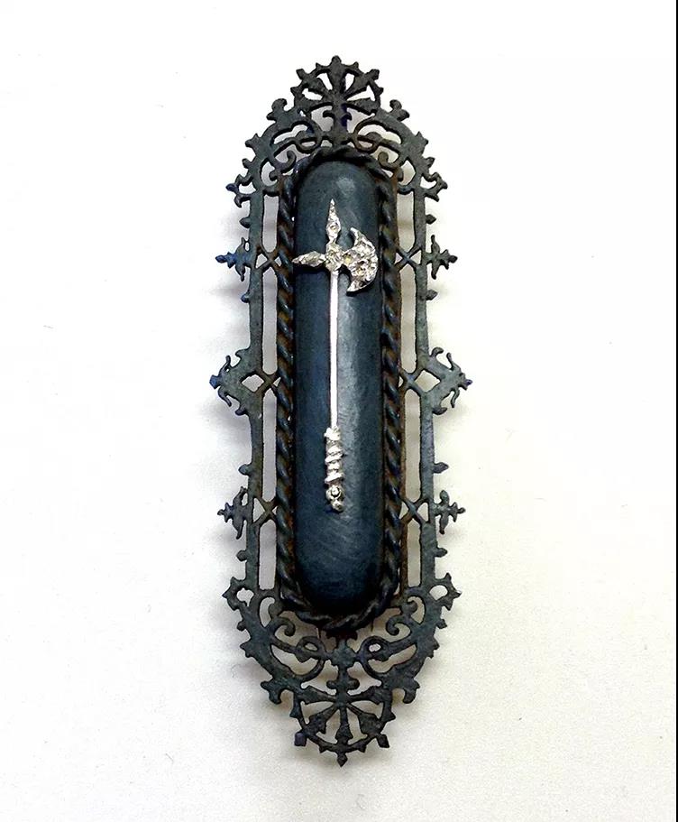 “田口史樹通過對主題和材質的巧妙處理,重新詮釋了胸針和吊墜。他的首飾似乎被精美的寶石所迷惑,通過不同的切割和角度折射出線條,藝術家通過將純銀雕鑿成一種模擬鉆石等寶石的光澤來達到這種效果。田口對銀的使用指向首飾價值的建構,暗示銀與貴重的巖石一樣光芒四射。田口曾說:“在不鑲嵌任何寶石的情況下,我常常使用制作寶石的結構來呈現金屬本身的力量和精致感。”胸針和吊墜類似于家族徽章或盾徽;通過破壞物質象征和清空徽章的肖像,胸針成為超越舊血統的新型關系的容器。”