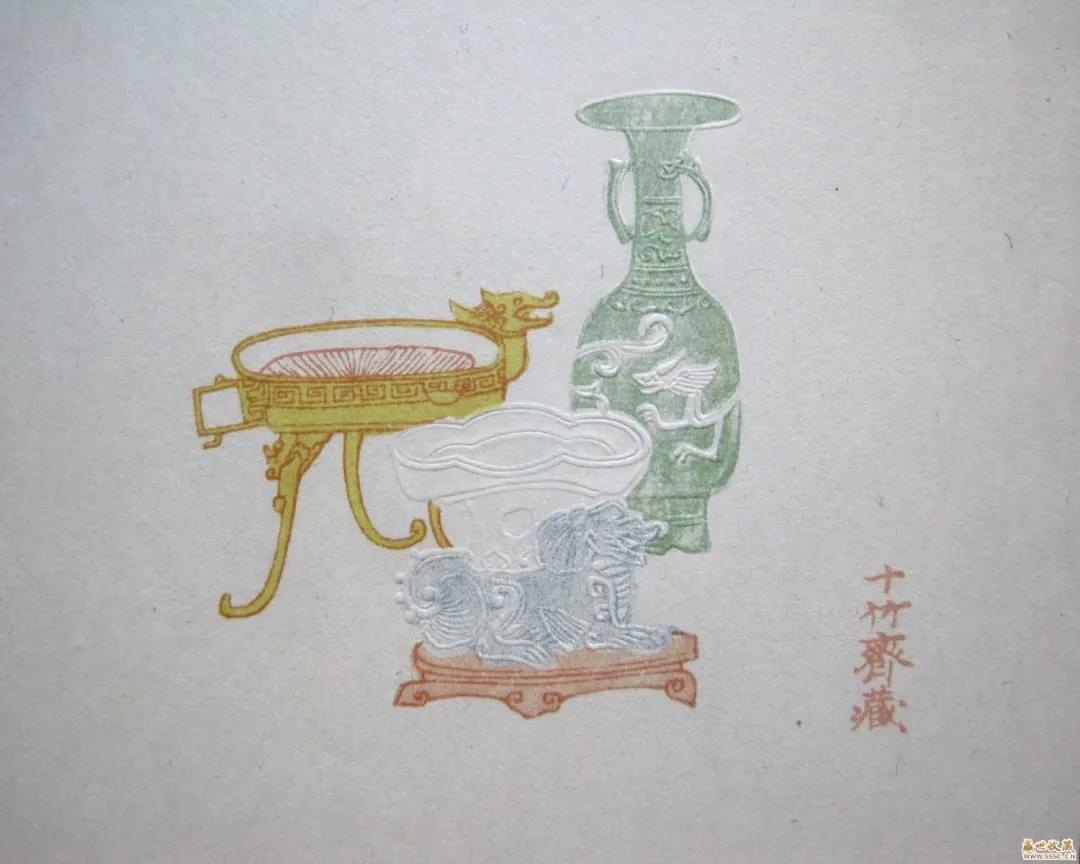 拱花,即將版雕成凹版浮雕效果,版內涂中藥白笈水,然后將宣紙按畫面需要部位局部濕水捶入,使紙面陷下緊貼雕版凹入的畫面,然后使其干透固定,紙面既出現無色的浮雕效果圖形,因圖形拱起而稱「拱花」。