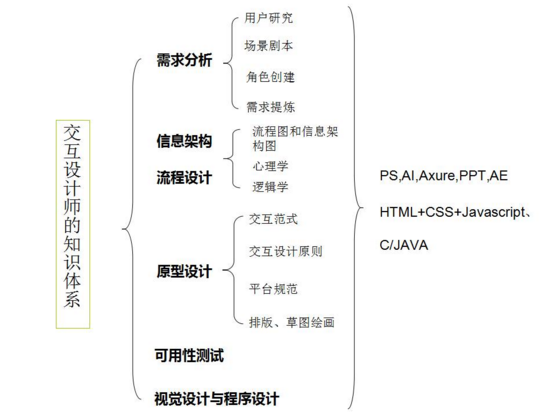 以上這張圖是交互設(shè)計(jì)師的知識體系,涉及到的內(nèi)容特別多,本文主要想給大家解釋的是UX和UI的關(guān)系,以后再詳細(xì)給大家介紹交互設(shè)計(jì)的其他方面。