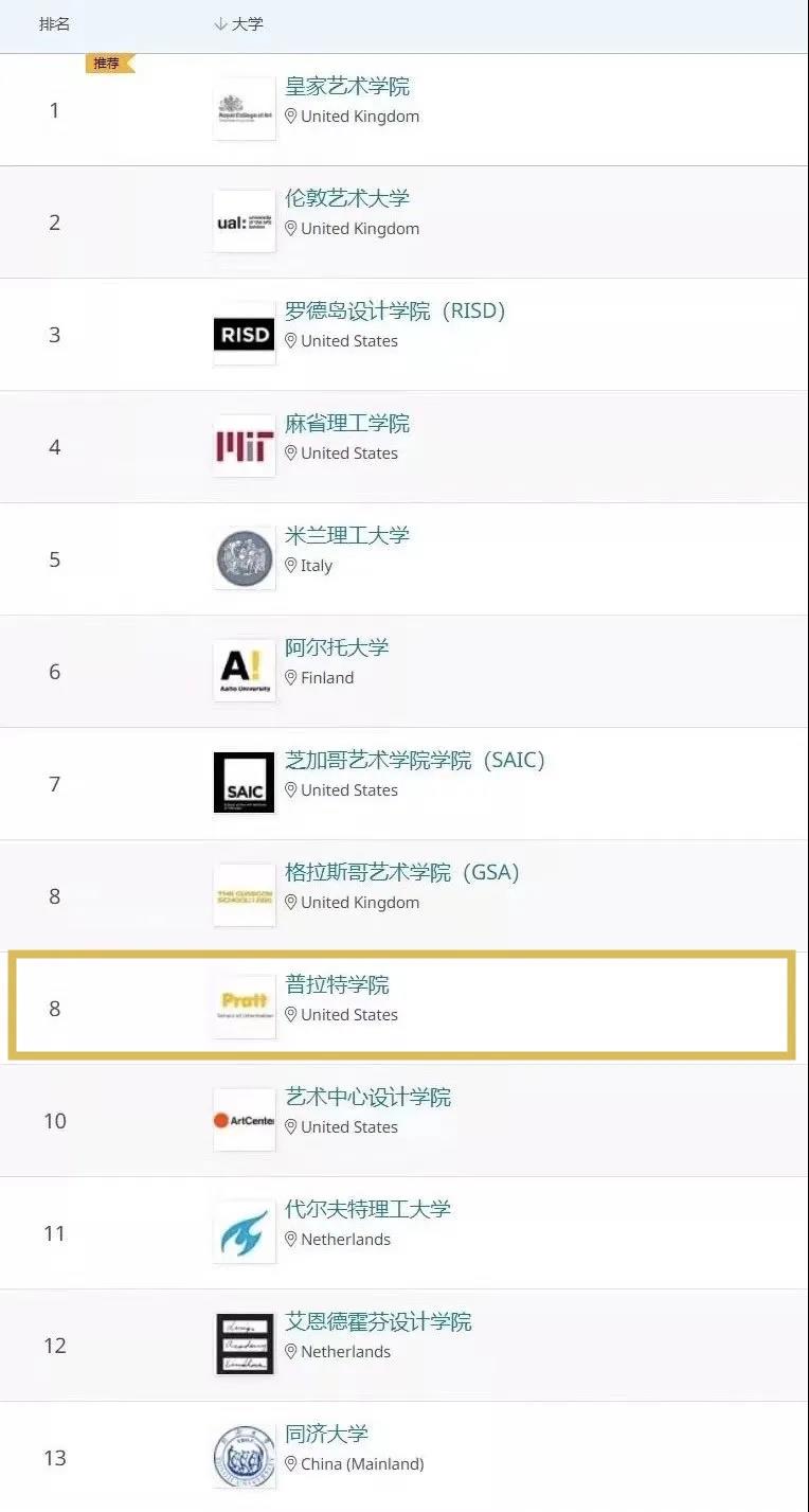 在2021年QS世界大學排行藝術與設計類中,Pratt位列全球第8。Pratt室內設計排名美國第1,工業設計排名美國第3。