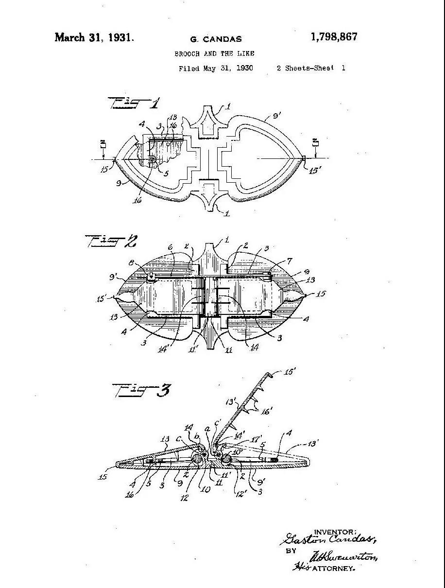 到30年代,法國巴黎公司Gaston Candas受到可拆分結構的啟發,發明了對夾的機械設計,即一件胸針可拆卸為兩件對夾。他們把這一設計帶到了美國,風靡一時。Dress Clip迅速成為了“人們必須擁有的時尚單品”。