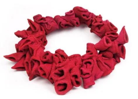 Takei還發現羊毛很適合用來制造首飾而不僅僅是裝飾品。她說:“我對首飾的想法很感興趣,我認為首飾不僅僅是裝飾。“在首飾制作中非傳統材料的規模和使用的轉變使我能夠挑戰這些想法。” 為了做到這一點,Takei使用紋理,顏色和構圖,創造軟和感官曲線,這是金屬所很難能實現的。像她驚人的超大體量項鏈,她所做的不僅僅是抓住觀眾的眼睛;她創造了一種渴望伸出和觸摸作品。