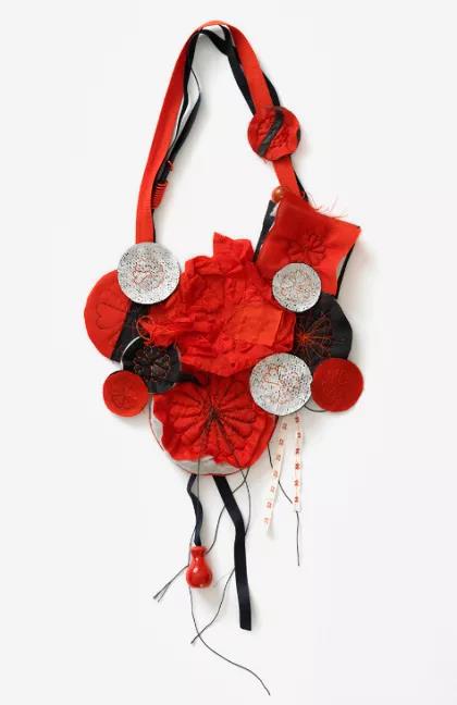 Sasakura的技術結合了金屬,織物,石頭和縫紉,靈感來自傳統的英國刺繡和日本護身符象征的御守。“御守是一種裝飾袋,由織物制成,刺繡圖案和象征性結來自日本寺廟和神殿。通過使用材料,我探索來自英國和日本文化的紋理、設計和圖案。”