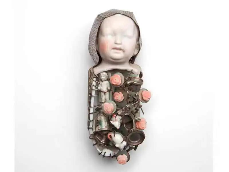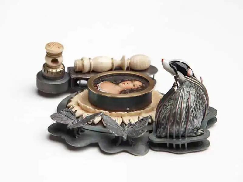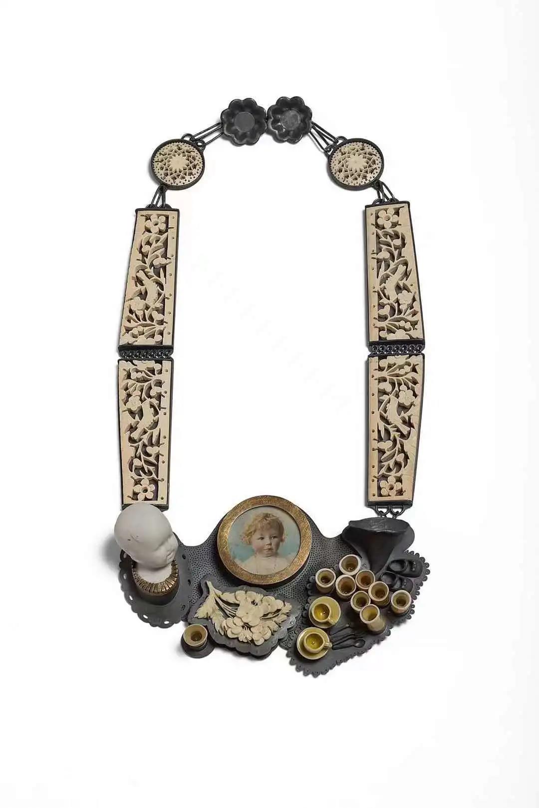 意大利首飾藝術(shù)家Barbara Paganin的作品大量地使用現(xiàn)有的物品來創(chuàng)作,通過主客觀時間關(guān)系的不斷交換,藝術(shù)家有效地檢驗了串聯(lián)起生活和每個人記憶的作品的價值。在《記憶》系列作品中,陶瓷動物、瓷娃娃、雕刻的象牙、森林、玻璃、出土、傳承和收集的舊照片的縮影與鞋子、衣服、日常使用的小工具和仿制寶石驚人混在一起。Paganin由此在作品中加持了層層的情感,在這個網(wǎng)中每個人都能找到自己的情感投射。每一枚胸針,每一條項鏈都在訴說一個故事,情節(jié)由我們來填充。