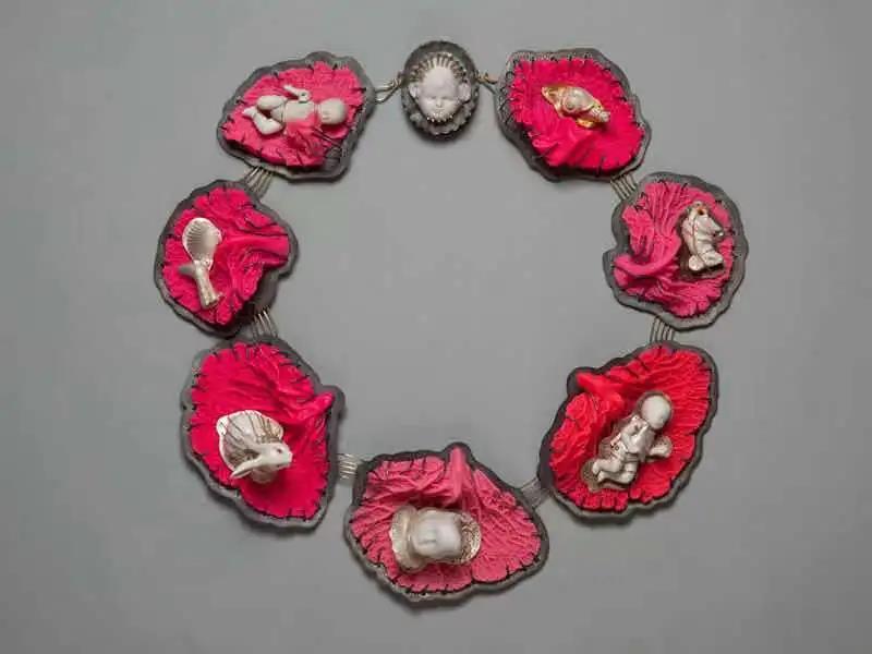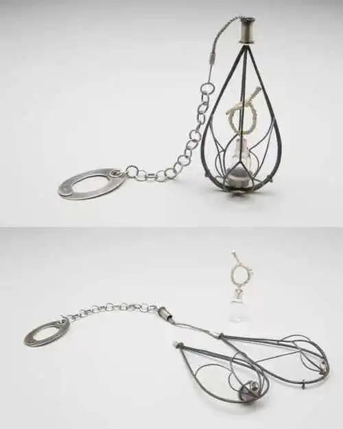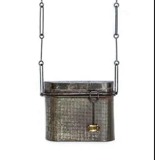 金屬是最常見的傳統(tǒng)首飾制作材料,然而,當代首飾中,越來越多的藝術(shù)家通過非傳統(tǒng)的材料去創(chuàng)作首飾;比如回收的硬幣、瓶蓋、老化的金屬配件、老舊毛巾、手提電話和洋娃娃部件。這些東西舍棄原本的功能,與柔和的色彩結(jié)合變成一件件項鏈、吊墜盒手鐲。這是一個緊張的回收過程。物品本來要被扔掉或者遺棄,藝術(shù)家們經(jīng)過特殊的選擇讓它們以不同的方式回到生活中。