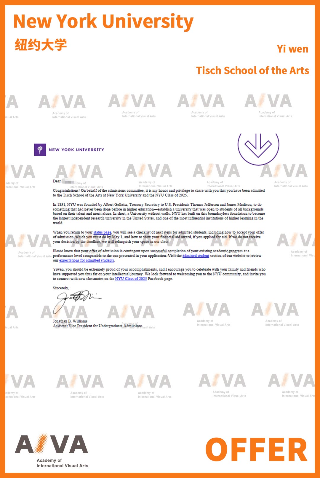 在今年的申請季中,AIVA的Yvonne同學憑借高質量的作品集及優異的學術成績,成功斬獲紐約大學Tisch藝術學院的本科錄取,同時還收獲了包括UAL、威敏、金匠、金斯頓、艾默生學院等多所頂尖英美院校大滿貫!(此處掌聲安排)