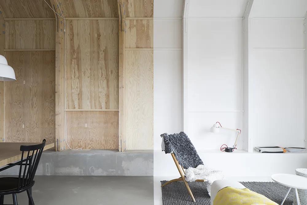 房屋內(nèi)的木梁與桁架采用了膠合板,為室內(nèi)帶來溫馨的氛圍。混凝土地板堅固耐用而又不失美觀,非常適合日常使用,并且在建筑四周都有所翻邊,形成一圈包圍建筑的低矮長椅。