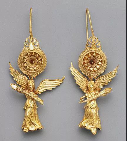 Greek, 225 – 175 B.C. Gold and glass. Earrings with Nike Pendants (Getty Museum) Flying figures of Nike, the Greek goddess of victory, form the main decoration of these Hellenistic gold earrings.