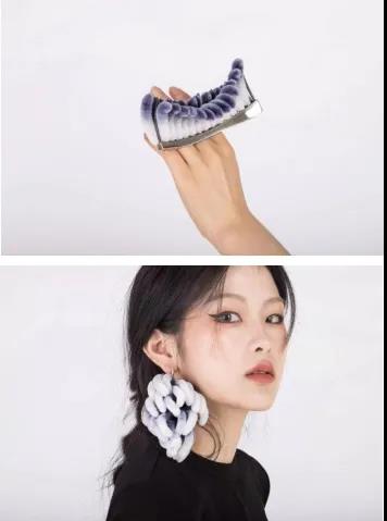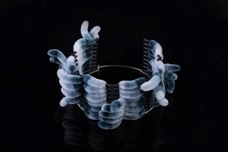 程艷玲的《Rong》系列作品使用的材料正如她使用的材料,皆是rong。她將較為傳統的絨花,與銀和現代的3d打印材料相結合,優化絨花結構的同時,也可以豐富和提高絨花的質感。“設計中延續了絨花一向的風格,但是沒有采用具象的花型,簡化了花的形態;也沒有采用傳統絨花鮮艷的顏色,而是選擇偏灰偏暗色系的絨花;連接方式拋棄了傳統絨花用絲線纏繞的方式,選擇了鑲嵌、榫卯等結構。”