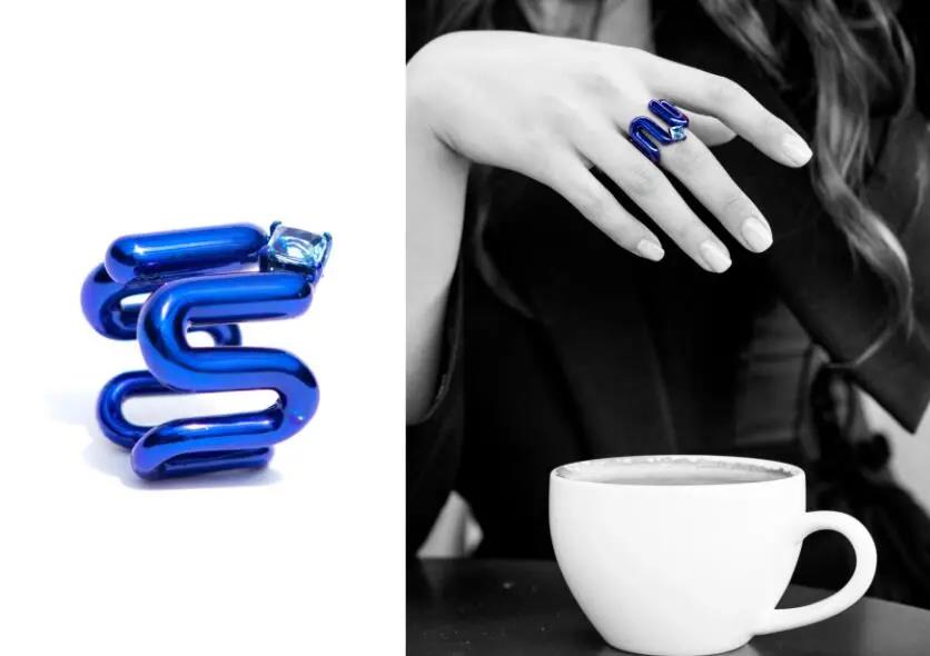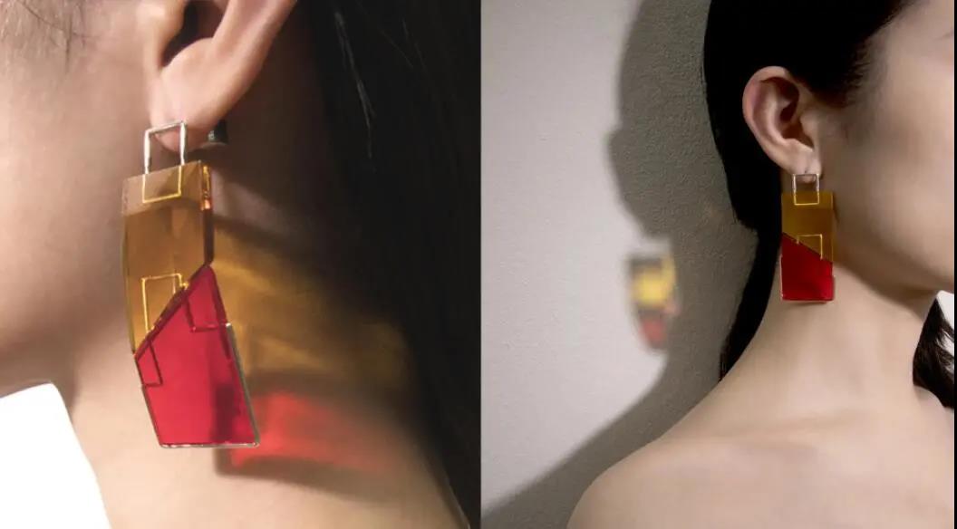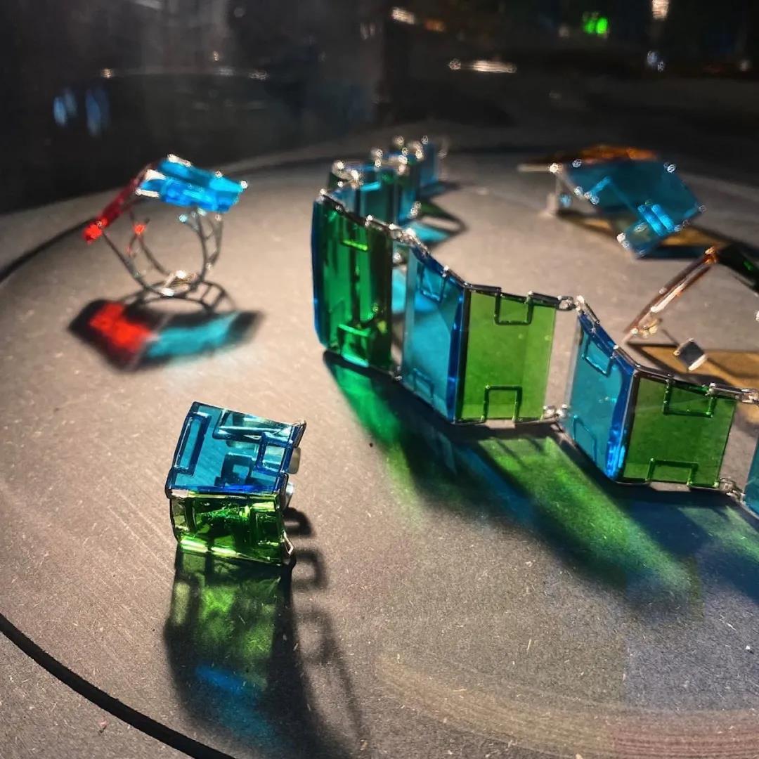 從活力耀眼的紅與黃,到平靜放松的藍(lán)與綠,每一件首飾都在觀者眼前構(gòu)成了一幅生動(dòng)的想象圖景:日出,海灘,春天,草坪…… 當(dāng)藍(lán)與黃交織時(shí),若隱若現(xiàn)的綠色在耳邊浮現(xiàn),不禁讓人聯(lián)想起夏日清涼的雞尾酒。伴隨著光影變幻和色彩嬉戲,首飾所創(chuàng)造的互動(dòng)空間微妙地影響著人們的情感體驗(yàn)。