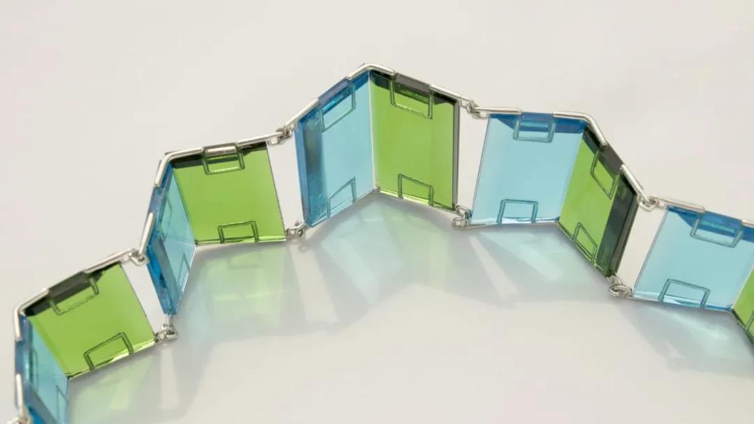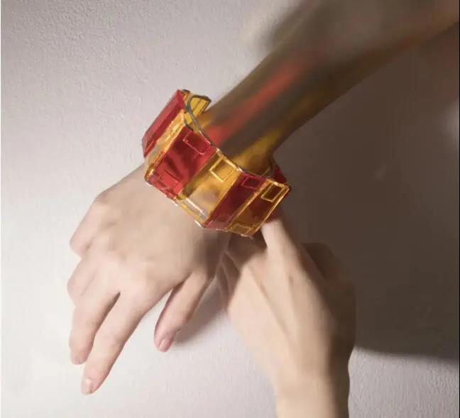 為了最大限度地讓光線透過(guò)玻璃,Xinyi 將幾何形狀的玻璃片巧妙地固定在了金屬框架上,兩片相鄰的彩色玻璃像折疊紙一樣形成了拱形的角度,在玻璃和佩戴者的皮膚上勾勒出交疊的色彩與光影,給予了細(xì)膩而豐富的視覺(jué)力量和情感提升。
