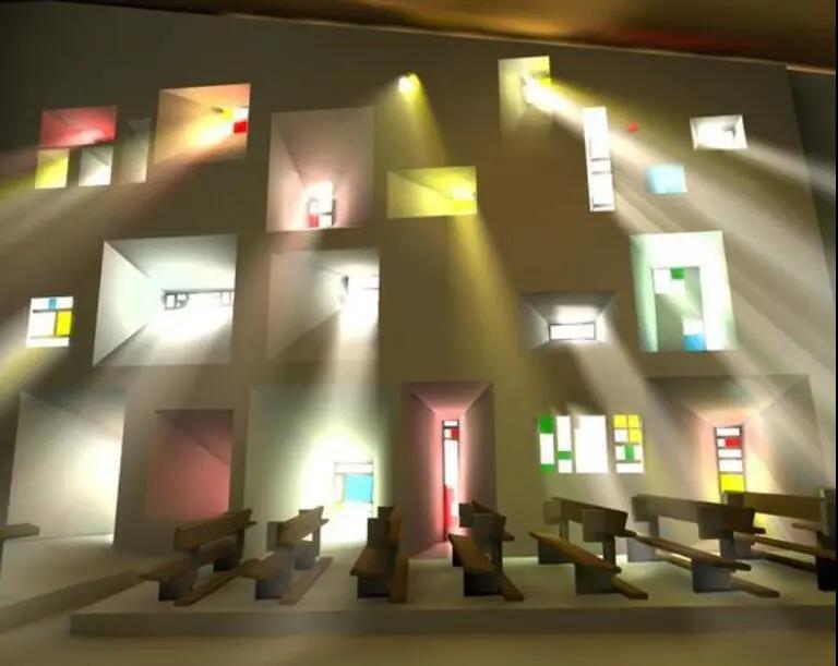 這一系列的靈感受到了法國(guó)建筑大師 Le Corbusier 在20世紀(jì)設(shè)計(jì)的朗香教堂(La Chapel De Ronchamp)的室內(nèi)氛圍的啟發(fā)。粗糙的白色墻面上開(kāi)著大大小小的方形窗洞,彩色玻璃如寶石一般被鑲嵌其中;光線透過(guò)屋頂和墻面之間的縫隙從窗洞投射下來(lái),為室內(nèi)營(yíng)造出了一種被光環(huán)繞的特殊氛圍。這種強(qiáng)烈的質(zhì)感便與建筑物樸素的白墻之間形成了對(duì)比,Xinyi 捕捉了這一特征,并將其融入進(jìn)了戒指與手鐲的體量和結(jié)構(gòu)之中。