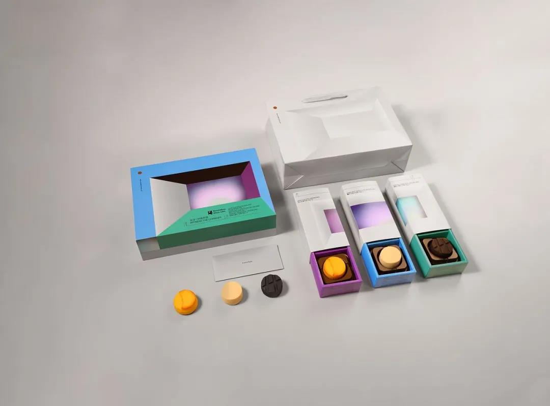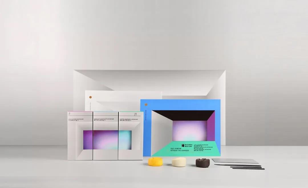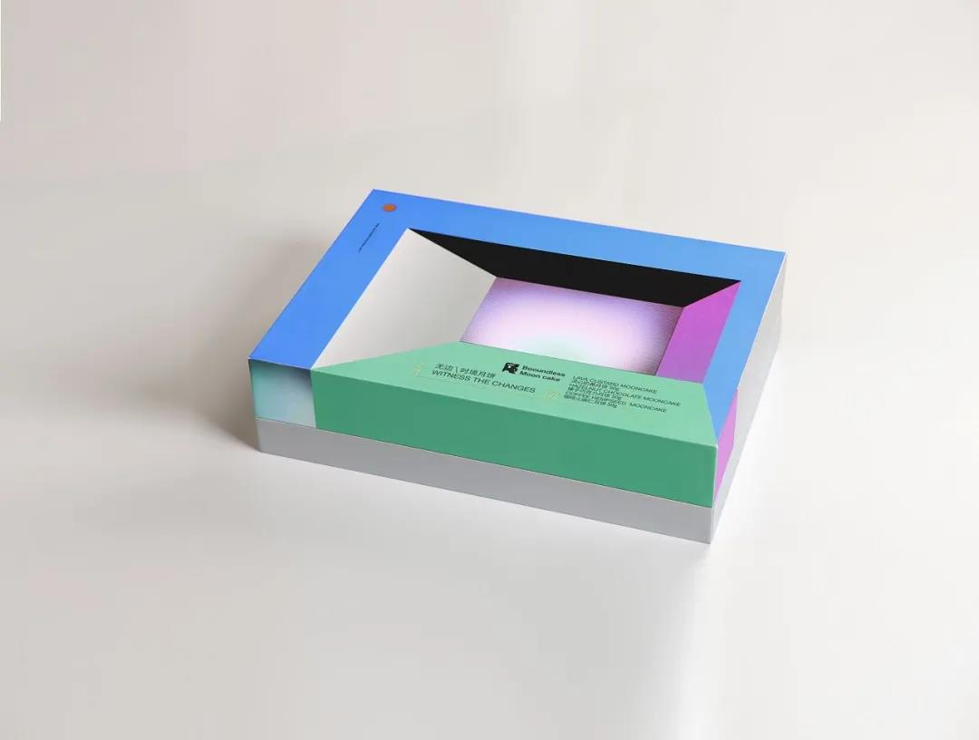 “無邊/時境”月餅禮盒用藍、紫、綠三種顏色進行過渡融合,營造出立體透視的縱深效果,模擬出不同狀態下的云端變化,具有強烈的設計感與時尚感。
