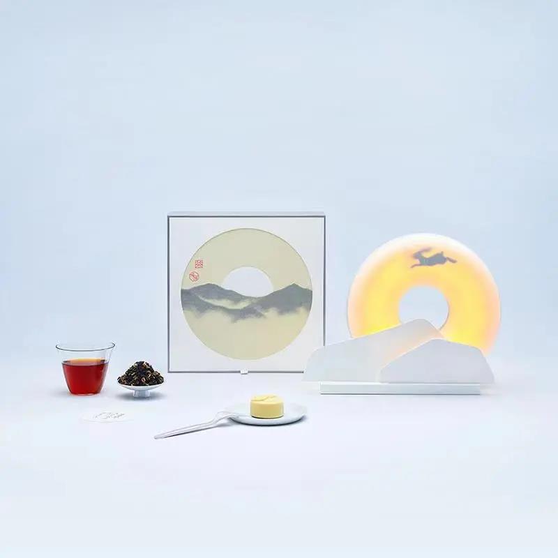 茶品牌“山田土”將天上的月亮摘下,放在了2021年的月餅禮盒中。用手輕碰,“月亮”就會亮起,還能看到一只“奔跑”的玉兔。禮盒的包裝設計從山水月夜的景致中汲取靈感,以現代波點結合漸變手法,呈現中國水墨畫式的當代意境。