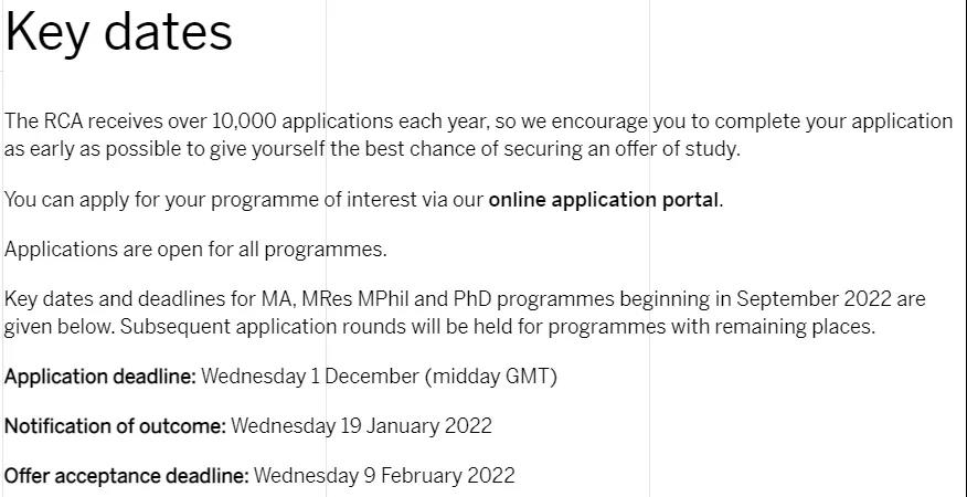 目前官網(wǎng)只公布了一個批次的申請截止時間,由于去年因疫情選擇延期的學生數(shù)量較多,因此目前不排除今年只有一輪申請的可能,想要沖RCA的同學們一定要把握住機會。
