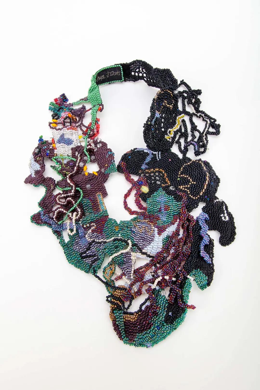 正如美洲原住民不斷變化的珠飾實踐所表明的那樣,珠子的材料可能會根據地理、用途、文化和個人偏好以及可用性而變化。當代藝術家——許多人有多種選擇——根據審美、概念、實用、個人和象征意圖做出選擇。例如,銀匠 Jasper Nelson 利用幾代納瓦霍家族的知識和興趣,創造出極簡美學的串珠項鏈。Linda Dolack熱衷于突出“我們共同渴望的食品”,她用玻璃珠覆蓋糖果盒、食品容器和雜貨車,諷刺地突出了消費主義。Holly Anne Mitchell 使用回收報紙制作串珠手鏈、胸針、項鏈。本次展覽的作品以一種共同的形式聚合在一起,反映了對材料、技術和佩戴性等多種觀點。除了解決這些形式上的問題外,藝術家們還探索了一系列社會和文化主題,包括對種族、物質消費和過剩的看法。