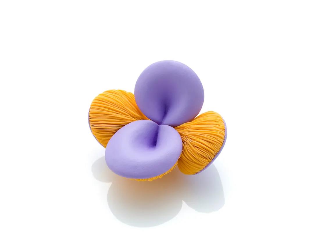 “我先是對蘑菇這一生物產生了好奇,我對蘑菇傘蓋之下相互交織的奇異美妙的形態著迷。生長在狹小空間的蘑菇啟發了我創作以“增殖形象”為主題的珠寶。隨著我了解蘑菇在自然界中的生長和作用,我對它們也越來越感興趣。我們離真菌如此之近,以至于我們甚至都沒有注意到它們。菌絲體,也可以看作是蘑菇的根,在我們腳下的地面上蔓延出難以想象的范圍。蘑菇,仍然是具有許多科學未解奧秘的實體,它在我的工作中占有重要地位,自從我成為首飾藝術家以來,我便一直被蘑菇的特征影響并因此創作一系列的作品。”