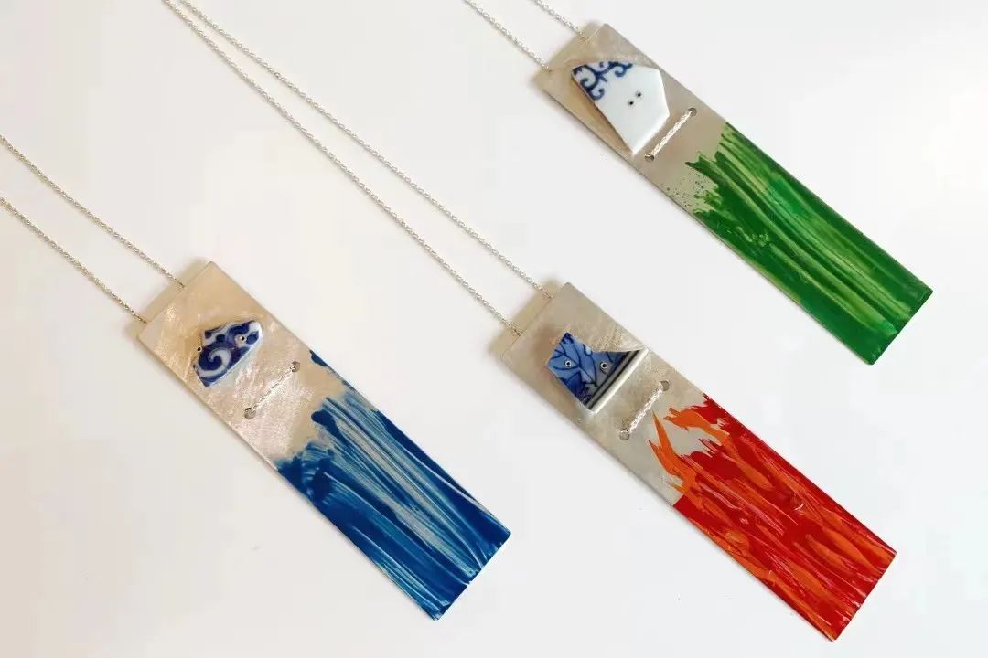在上面這件作品中,Deganit Stern Schocken把粉彩瓷片與時針結合起來,意圖表現舊瓷片的歷史感和時間感。她的這兩件吊墜作品表明了一種無所顧忌的混搭的可能性,具有強烈的脂粉氣和女性意味。她把本應被丟棄的破碎之物置入了一種全新的語境中,在這個新的語境里,碎瓷片既可以被看作為一個容器的基座,又可以變為一件與身體親密接觸的首飾。