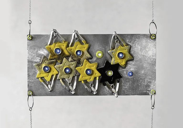 2011年,Deganit應邀參加主題為“神圣”(Holliness)的藝術首飾群展而制作了上圖的吊墜,她在金黃色的“大衛星”上點綴以色列國旗的藍色和白色,“大衛星”曾經是猶太人大屠殺時被刻上的標記,Deganit把它制作成一朵朵美麗的小花,表達了從悲痛的黑暗歷史中生長出樂觀生存的希望之花。