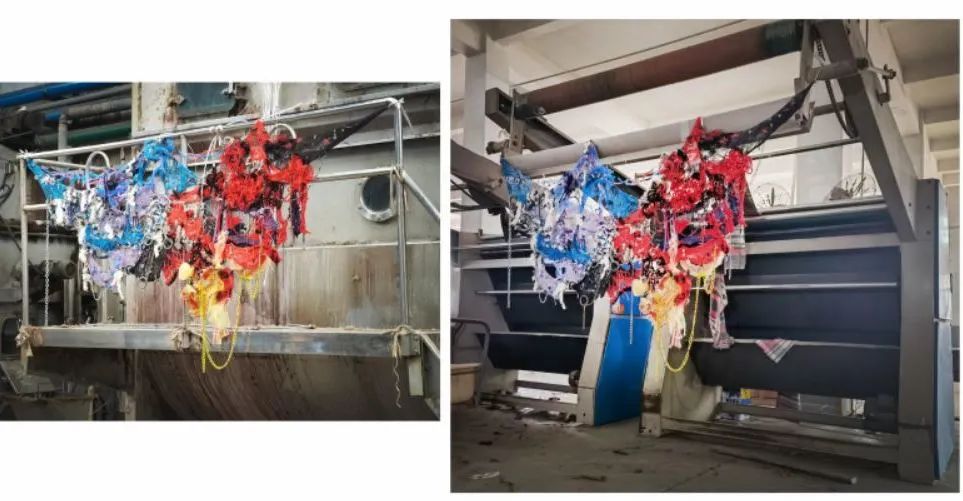 我用塑料材質(zhì)(塑料管、泡泡紙)、金素材質(zhì)和網(wǎng)狀材料來代表污染物,給他們?nèi)旧靡恍┟€、碎布、紗線、毛氈來表現(xiàn)植物的質(zhì)感,將這兩種反差很大的材質(zhì)通過編織、縫線等等的方式結(jié)合到一起,來體現(xiàn)我的主題,污染和自然環(huán)境互相滲透。