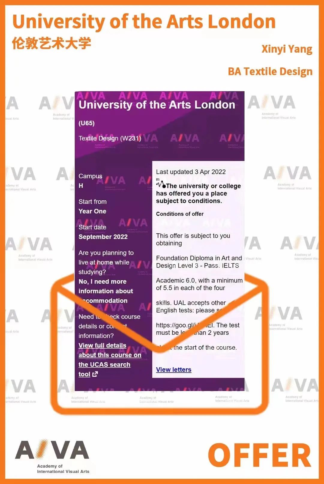 上周四,AIVA本科預(yù)科服裝專業(yè)學(xué)生Xinyi參加了UAL線上面試,順利拿到了切爾西王牌專業(yè)——紡織設(shè)計的offer,讓AIVA所有老師都倍感激動!而更多的offer還在飛來中~